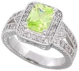 I returned the item because I decided that, though it was pretty, it just wasn't for me, and it was very, very easy- no hassles, and Sabrina Silver even paid for the shipping, all I had to do was have my mail carrier pick it up. I really appreciate this kind of customer service when buying online, and I would definitely buy from Sabrina Silver again because of it! They have a really nice selection and good prices.Get more detail about Sterling Silver Vintage Style Engagement ring, w/ an 8 x 6 mm (1.5 ct) Emerald Cut Light Peridot-colored CZ Stone, 1/2" (12mm) wide.